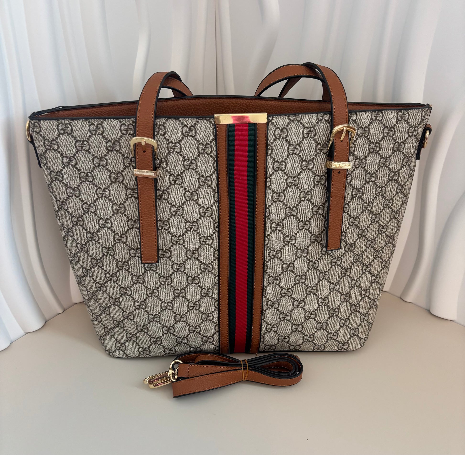 Meet the do-it-all tote. ✨ A structured monogram carryall with a bold center stripe (red/green vibes), caramel trim, and gleaming gold buckles. Wear it by the top handles or clip on the detachable crossbody strap for hands-free errands. Roomy, polished, and so Simply Chic. 🤎👜