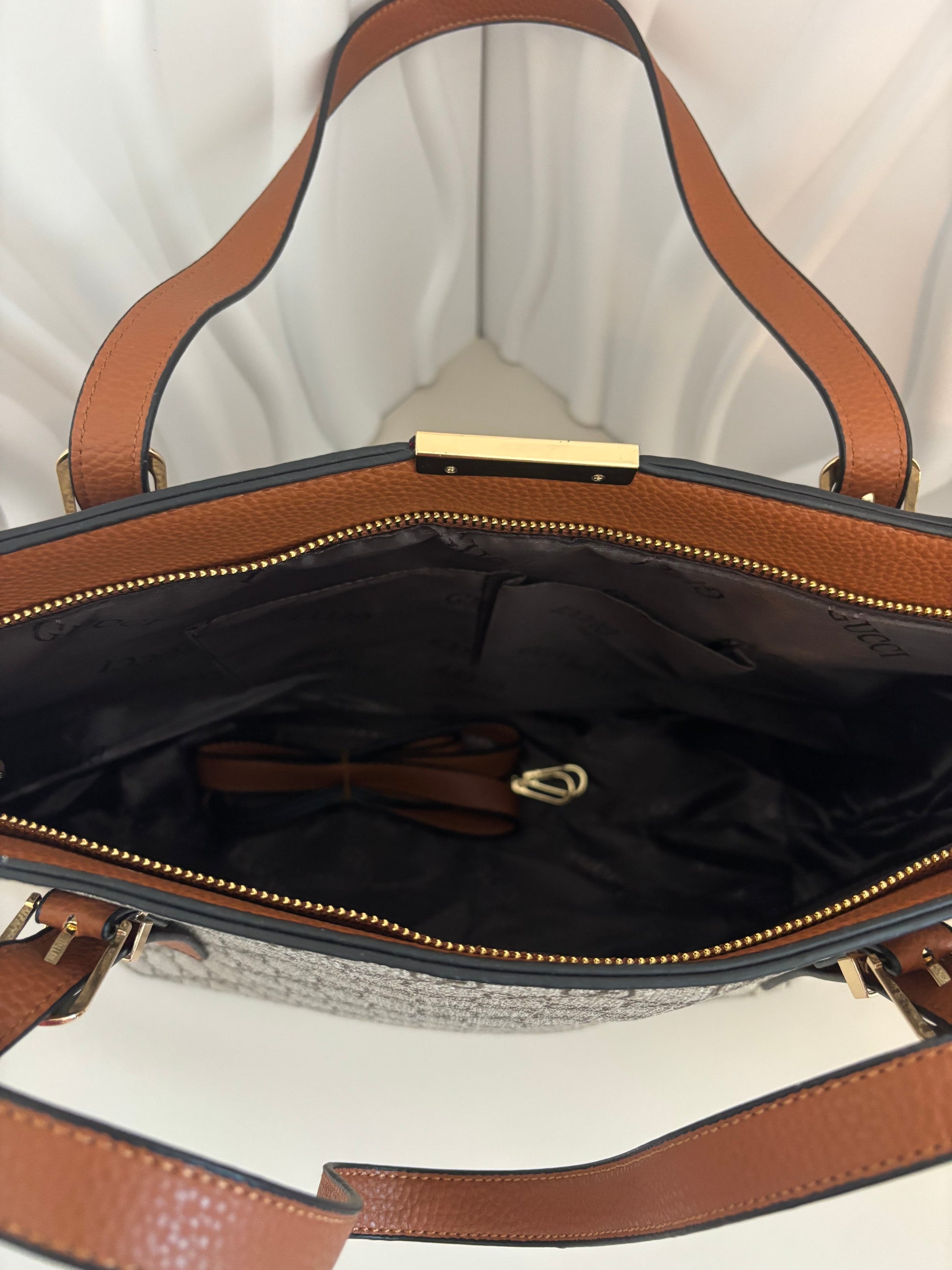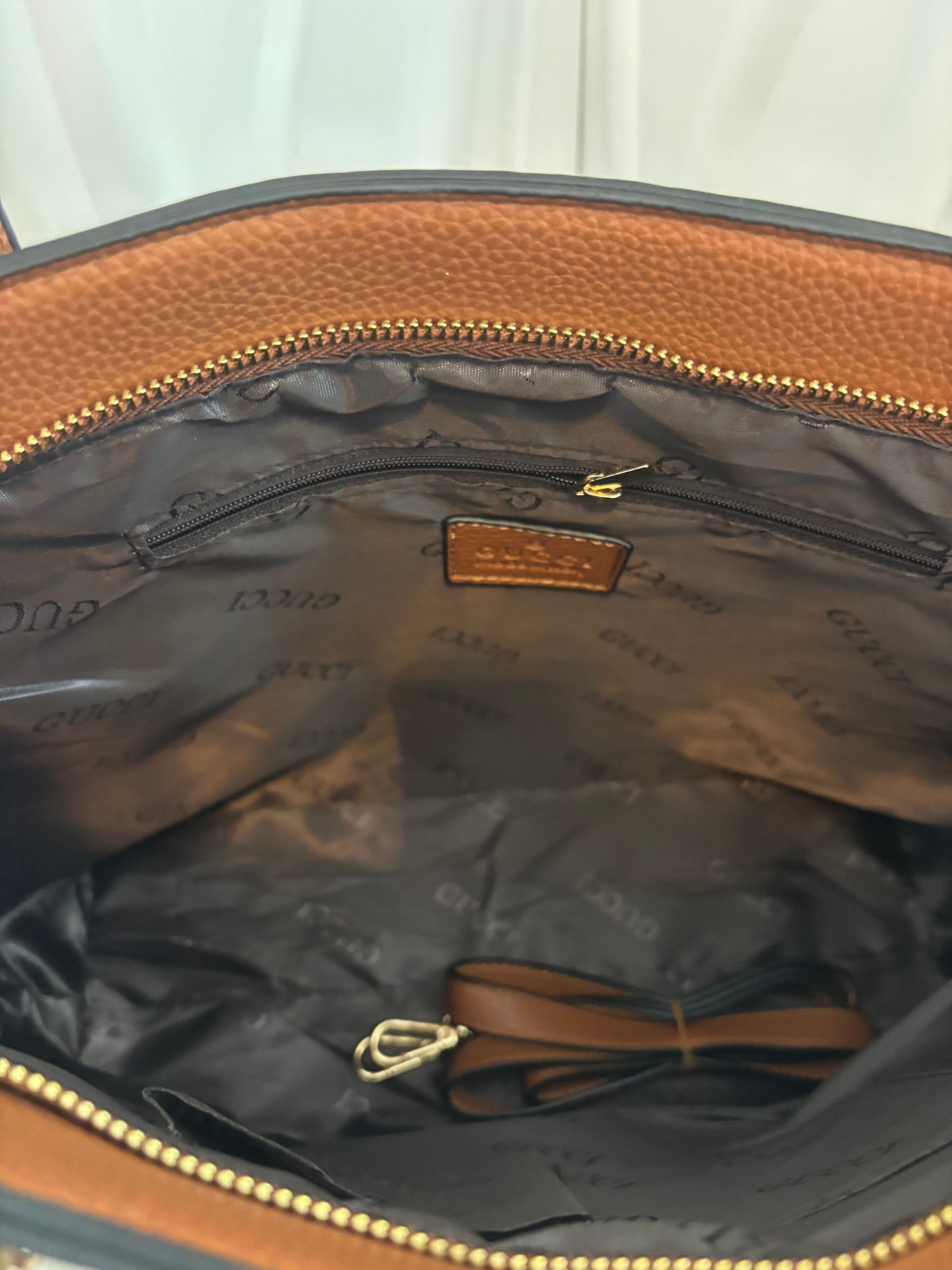 - Color: Taupe/brown monogram with caramel trim & red/green stripe