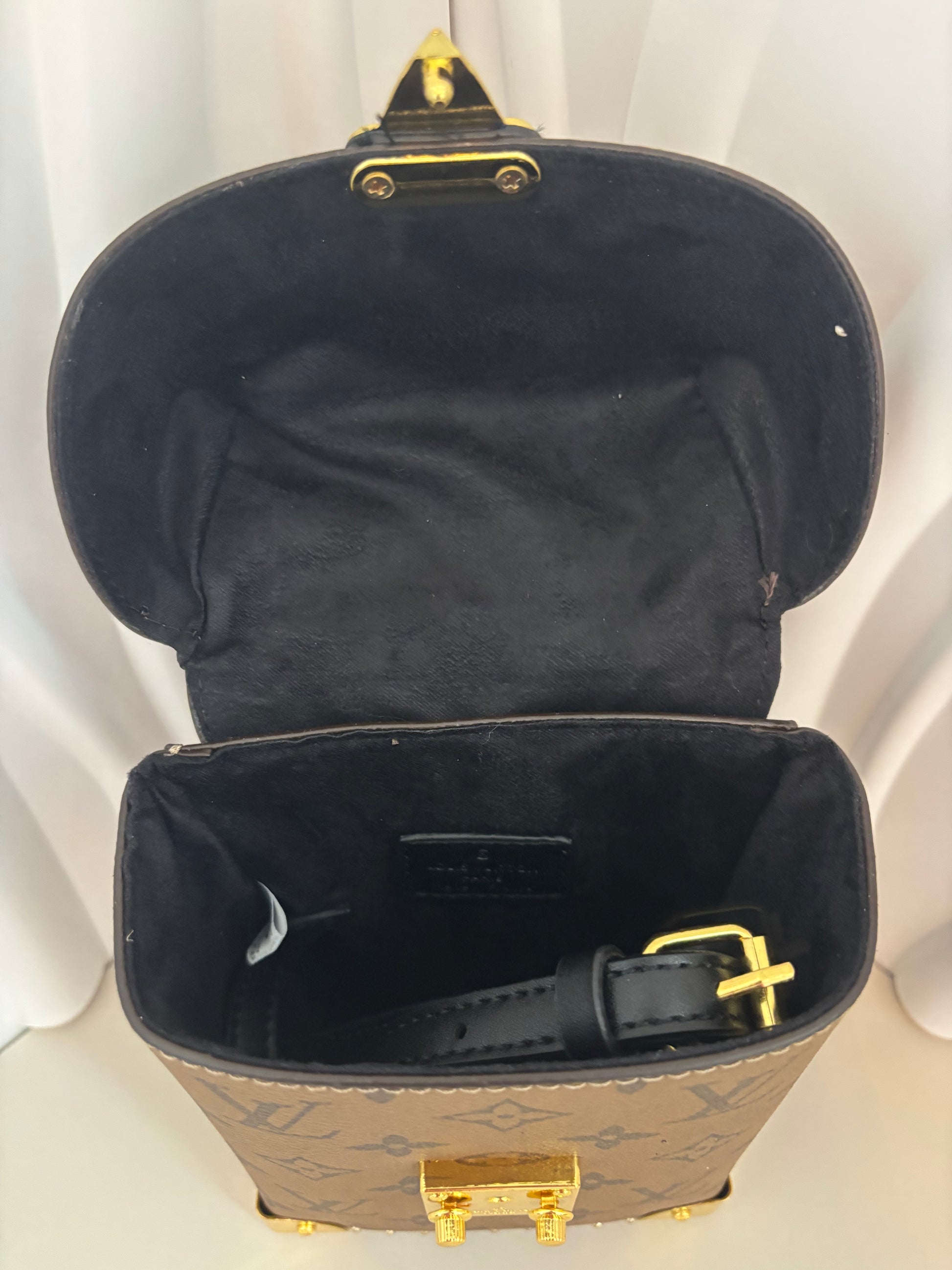 Hello, statement piece! โจ This inspired mini trunk features a chic top handle, adjustable crossbody strap, gleaming lock hardware, and gold corner caps. Two-tone monogram + structured shape = instant outfit upgrade. Hands-free or handheldโyour call. ๐๐